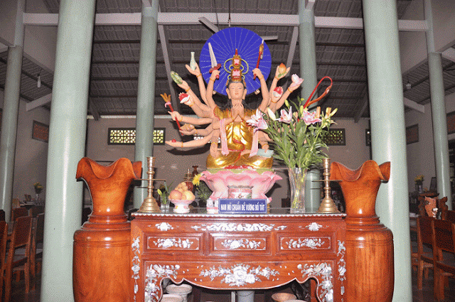 Bên trong Chánh điện thờ Tôn tượng Đức Phật Thích Ca, hai bên tả hữu là Bồ tát Văn Thù, Phổ Hiền; phía trước cửa ra vào là ban thờ Hộ Pháp Vi Đà và Tiêu Diện Đại sĩ.