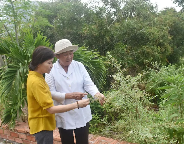 Trong khuôn viên chùa có phòng khám Hưng Thắng Tự chuyên bốc thuốc, chữa trị bệnh miễn phí cho người dân. Trong ảnh: Lương y Lê Thanh Tốt (bên phải) giới thiệu về cây thuốc từ bi.